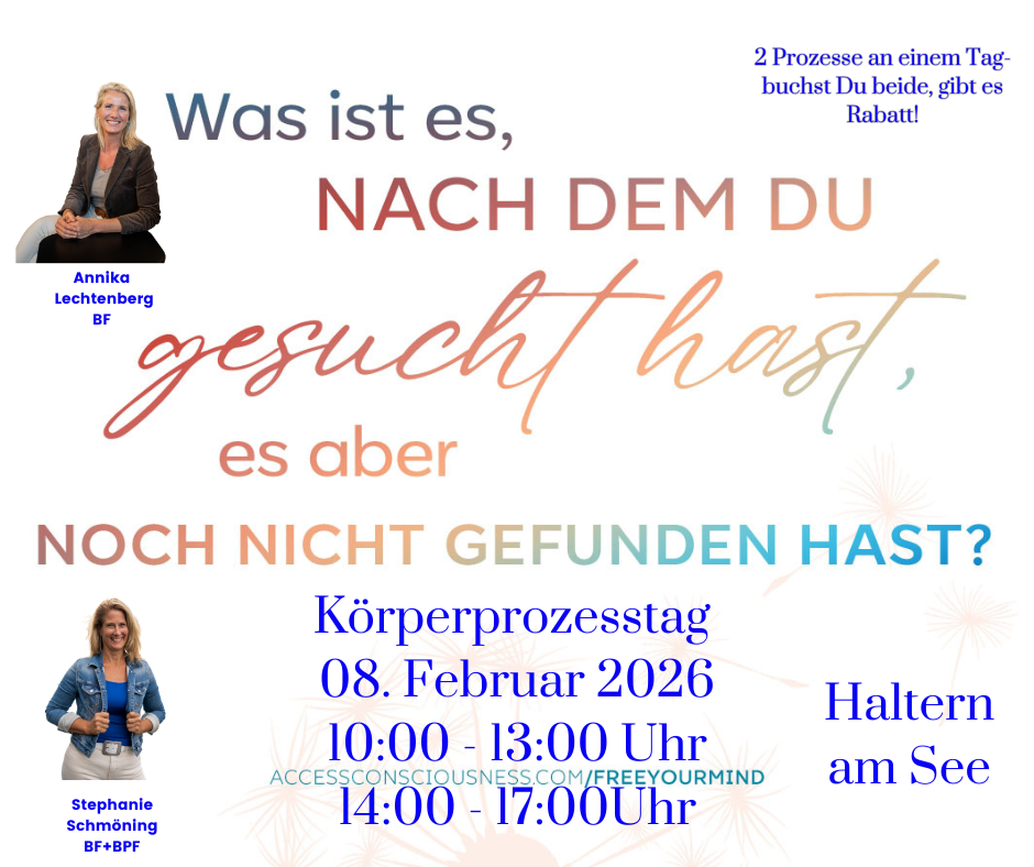 Ein Access Consciousness Körperprozess ist eine praktische Methode, bei der an verschiedenen Stellen des Körpers die Hände aufgelegt und an jeder Stelle bestimmte Energien zum Laufen gebracht werden. Diese Prozesse erleichtern dem Körper die Rückkehr zu seinen ursprünglichen Funktionen und Langlebigkeit. Die Energien sind die natürlichen Energien, zu denen unsere Körper von überall im Universum Zugang haben.